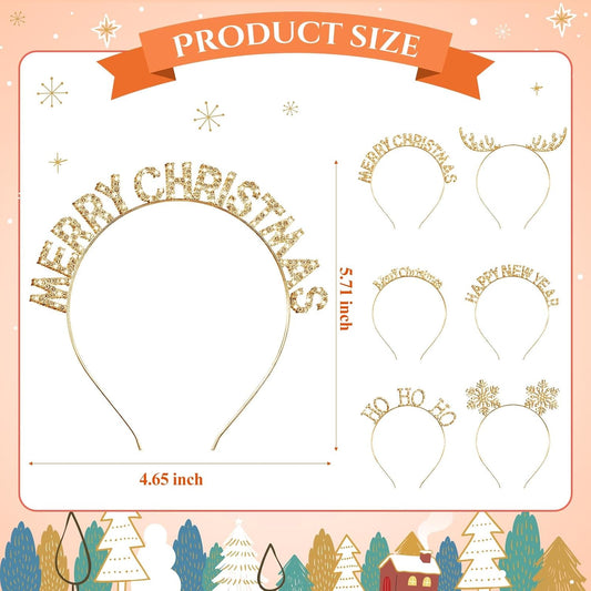 6 Pack Christmas Headbands - Rhinestone Snowflake Reindeer Antler Tiara Gold